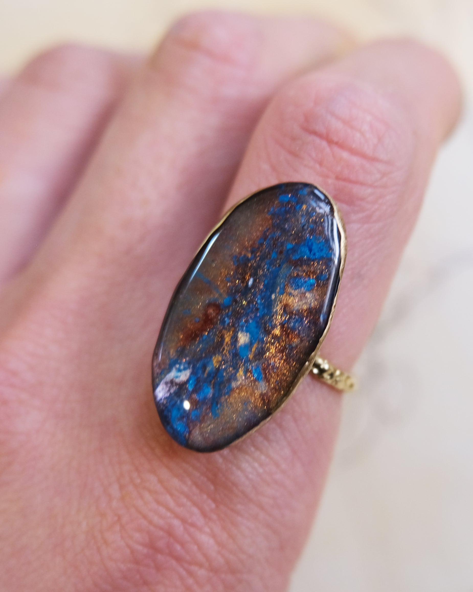 独創的な存在感を放ちながらも、肌なじみ良く構成された色彩バランスで着ける人の個性を引き立たせます。